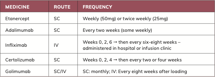 - Infliximab (Remicade and biosimilars) – administered in hospital or infusion clinic;