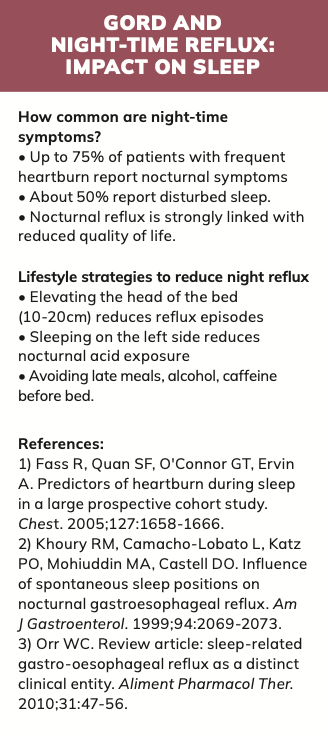 Night-time reflux is common and disruptive. Patients should be advised to elevate the head of the bed by 10–20cm using blocks or wedges, rather than additional pillows, which can worsen flexion. Avoiding late meals and alcohol before bed also improves nocturnal control. Left-side sleeping has been shown to reduce reflux episodes compared to lying on the right side.