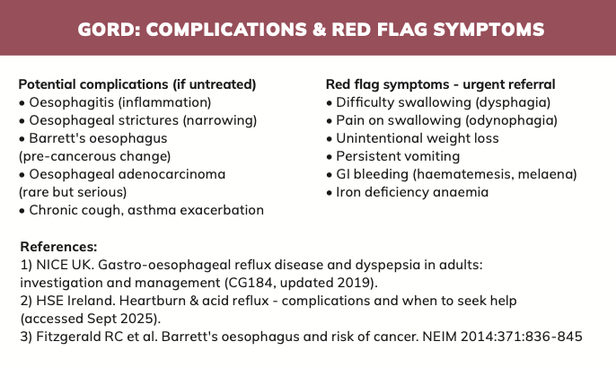 While most cases of GORD can be safely managed in primary care, there must be vigilance for red flag features that may suggest oesophageal cancer, peptic ulcer disease, or other serious pathology. These include: