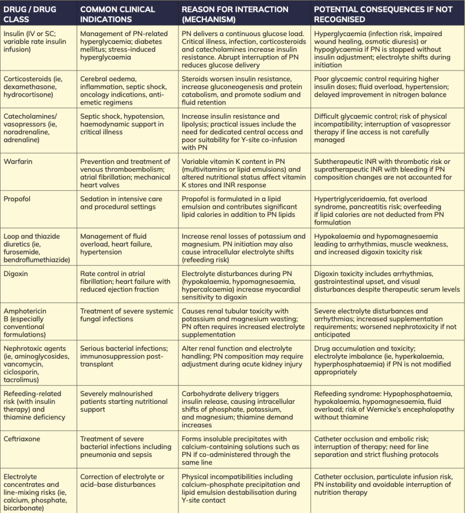 Table 2 highlights drug interactions commonly encountered during parenteral nutrition. It includes typical indications for each drug, the mechanism of interaction with PN, and the potential clinical consequences if not recognised.