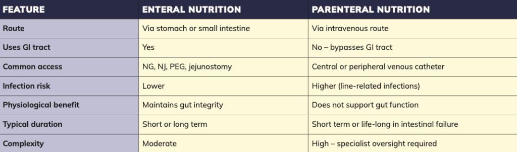 The fundamental principle underpinning clinical nutrition is that if the gut works, it should be used. Enteral feeding sup- ports gut mucosal integrity, preserves immune function, reduces bacterial translocation, and is associated with lower rates of infectious complications. For these reasons, enteral nutrition is always preferred where feasible.
