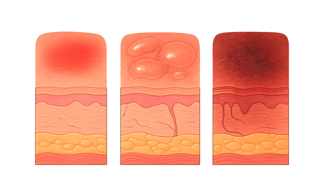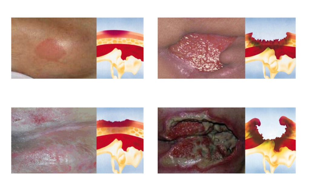 Grade 3: Full skin loss with damage to subcutaneous tissue, but no exposure of muscle or bone ? may contain slough. Grade 4: Deep destruction involving muscle, bone, or supporting structures, often leading to serious infection. Unstageable: Full-thickness loss where the base is obscured by slough or eschar ? true depth can’t be determined until cleaned.