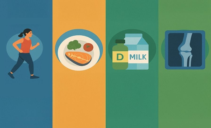 Beneficial exercise includes swimming, gardening, walking and golf. Eating a diet rich in calcium is important for maintaining healthy bones. Dairy products and green-leafed vegetables are good sources of calcium. Low or non-fat versions of dairy products do not have less calcium than full-fat versions. People with an intolerance of dairy can as an alternative drink orange, grapefruit, and apple juice, which are calcium-fortified and have as much calcium as milk.