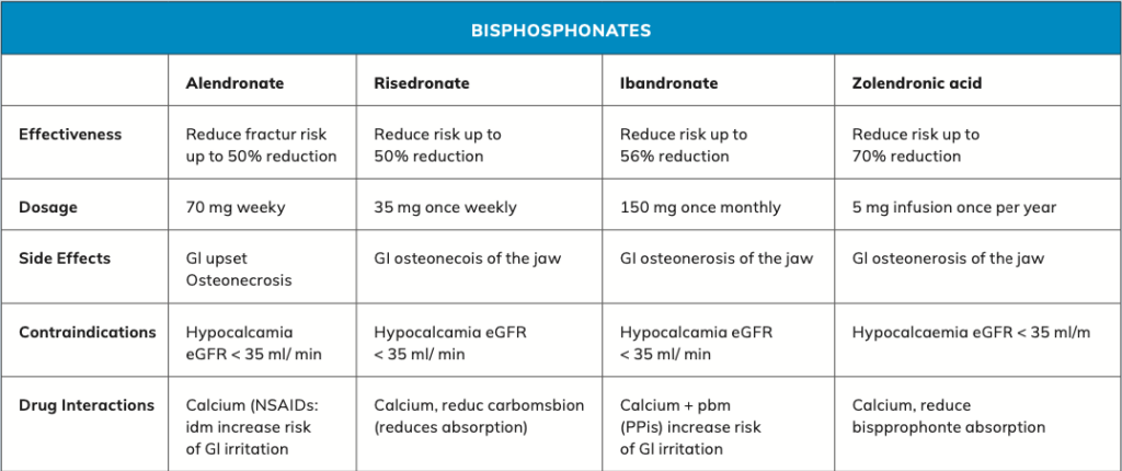 - Find difficulty complying with the specific instructions for administering oral bisphosphonates (hour before food, sit or stand for period after taking) or oral bisphosphonates are contraindicated or not tolerated; and