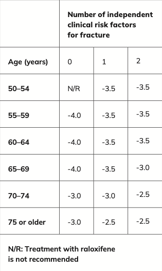 - Have a combination of T-score, age, and number of independent clinical risk factors for fracture as indicated in Table 2. Independent clinical risk factors for fracture include: