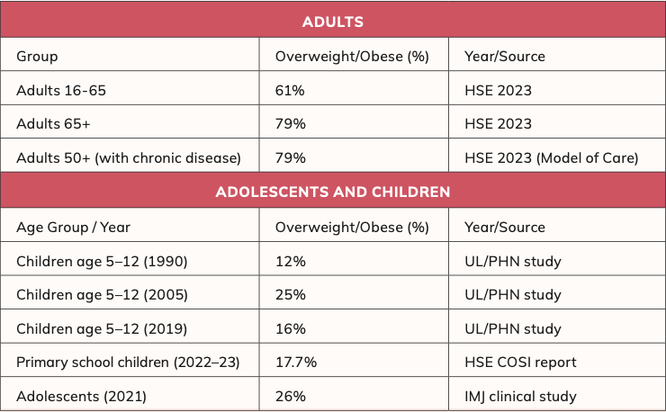 Irish data consistently show that the majority of adults are now either overweight or living with obesity, while childhood rates, although stabilising in some groups, remain a serious concern. The clinical and economic burden is substantial.