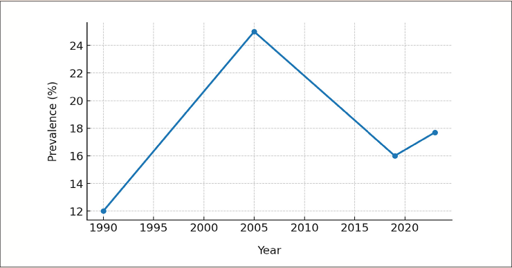The graph illustrates a sharp rise in childhood obesity, from 12 per cent in 1990, to 25 per cent in 2005. This spike is attributed to lifestyle changes, increased consumption of energy-dense foods, and reduced physical activity. Following 2005, rates declined significantly, reaching