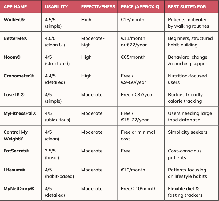 Noom®: A behavior-change app using daily CBT-based lessons and coaching. Evidence suggests significant, sustainable weight loss for regular users. Strong effectiveness but relatively costly at approx €65/month.