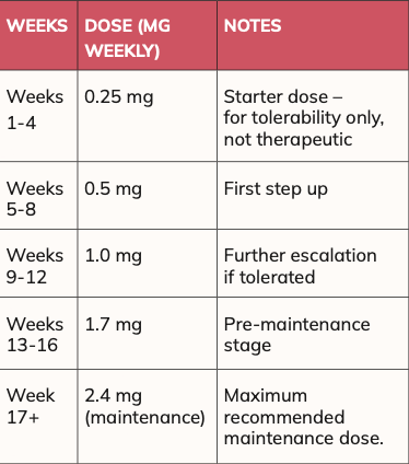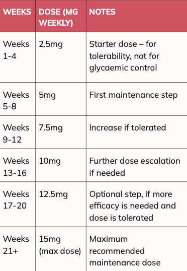 Starting dose is 2.5mg once weekly (for four weeks, mainly to help with tolerability). In relation to maintenance/ titration, usually increased every four weeks as tolerated, up to a maximum of 15mg once weekly.