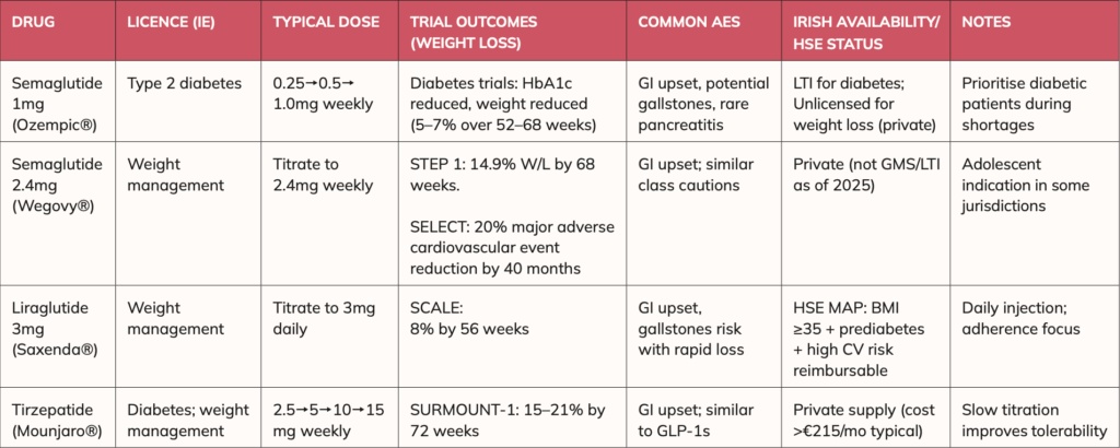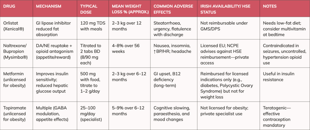 - Irish status: Licensed in the EU; as of 2025, NCPE advice advises against HSE reimbursement, so access is via private prescription only. Assess affordability and cardiometabolic risk carefully.